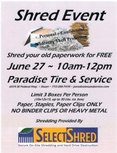 It was certainly like Shredding in Paradise in the 89° F temperature. We were shaded under a red tent provided by Lisa. Appreciative customers arrived on the lot to have their oil change and other auto service done. They also got some secure on-site document shredding done on a sunny Saturday morning in Stuart. We appreciated the opportunity to provide this shred event for Paradise Tire and Service.
